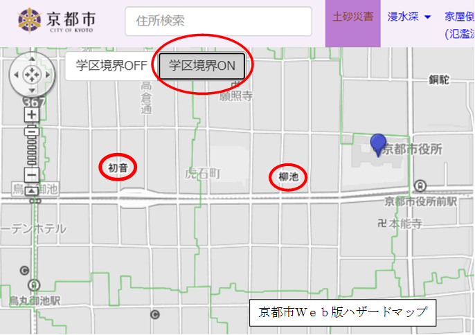 自分の住んでいる学区の調べ方は、京都市Web版ハザードマップ等でも確認することができます。