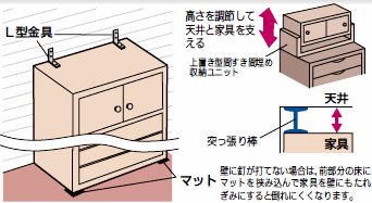 家具の配置を工夫したり、金具や突っ張り棒、隙間埋め収納ユニットなどで転倒しないような対策をしましょう。