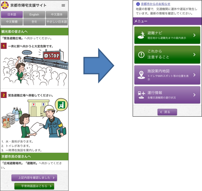 また、帰宅困難者の帰宅支援に役立つ京都市帰宅支援サイトや帰宅困難者NAVI(関西広域連合)の周知もしておきましょう。