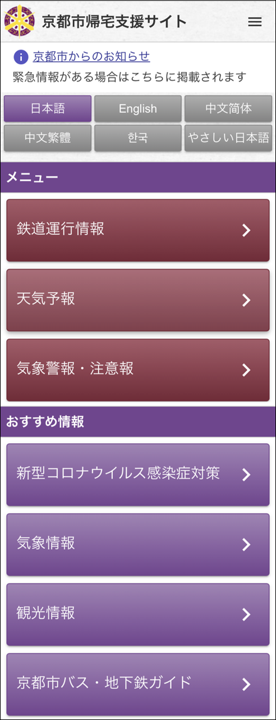 災害時等の情報収集には、交通機関の運行状況等が確認できる「京都市帰宅支援サイト」をご活用ください!(次のリンク画像をクリックするとサイトに繋がります)