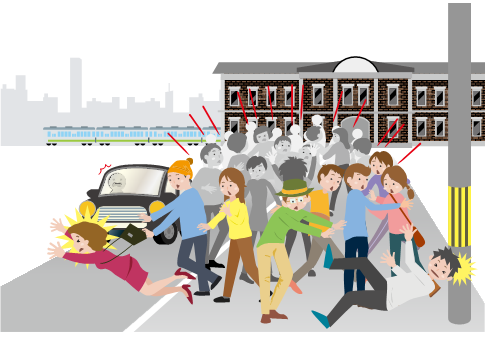一斉に駅に向かうと大変危険ですので、大規模災害発生時は緊急避難広場にとどまりましょう。