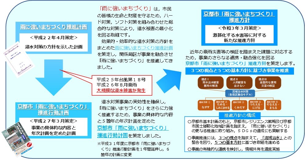 平成22年4月に策定した雨に強いまちづくり推進計画は、全市的視点から取り組む主要な政策を示す「はばたけ未来へ!京(みやこ)プラン」において、政策を推進するための「分野別計画」の1つとして位置づけられており、関係局区が事業を融合させ、「雨に強いまちづくり」を推進してきました。