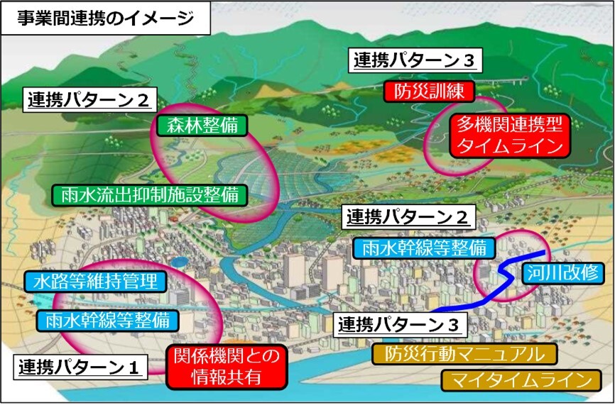 京都市「雨に強いまちづくり」推進方針では、流域治水を推進していくため、「3つの連携パターン」を設けることにより、各基本方針に基づく浸水対策事業(ハード対策およびソフト対策)の連携を強化しています。