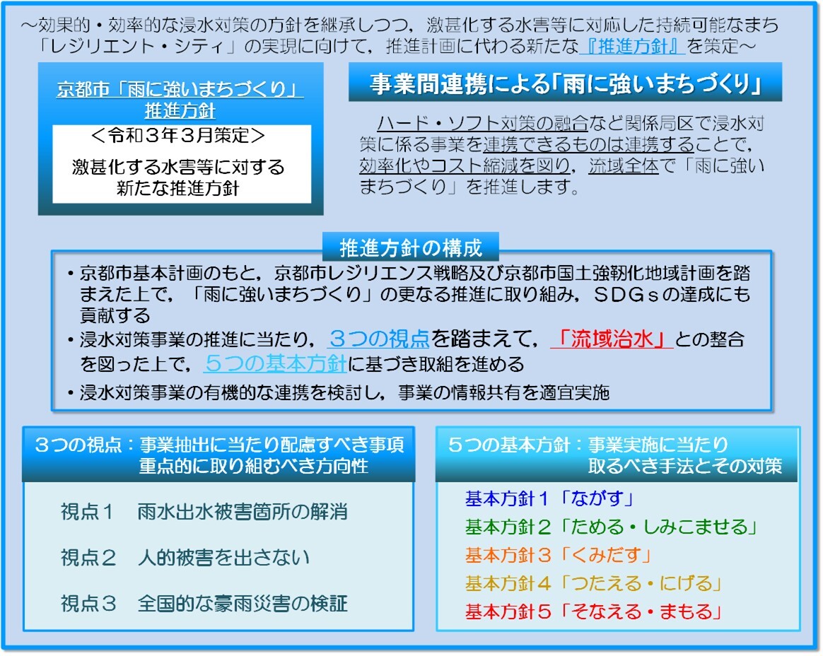 雨に強いまちづくりでは、「雨水出水被害箇所の解消」、「人的被害を出さない」、「全国的な豪雨災害の検証」の3つの視点を踏まえたうえで、集水域から氾濫域まで、流域のあらゆる関係者が連携して流域治水に取り組む「流域治水」の考え方に基づいて、ソフト・ハードあらゆる対策を関係局区の更なる連携および融合を強化して取り組むための、『京都市「雨に強いまちづくり」推進方針』を令和3年3月に策定し、各局区が連携した取組を推進しています。