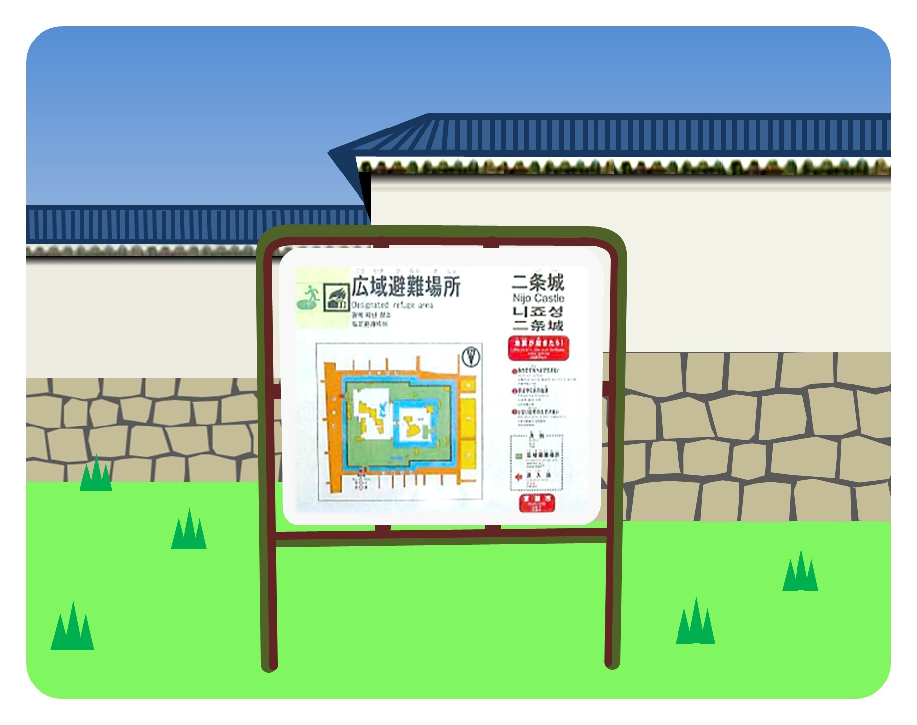 京都市では、災害発生時の広域避難場所への安全な避難誘導等を目的として、広域避難場所標示板と広域避難場所誘導標識を設置しています。