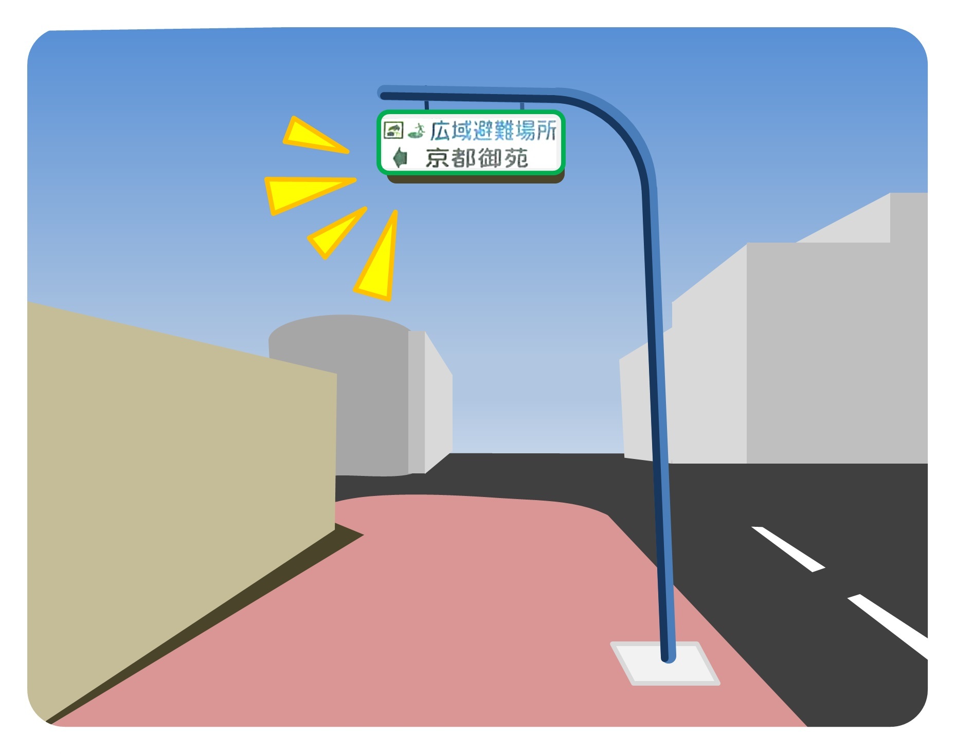 広域避難場所への経路を周知し、災害発生時に市民の皆様を安全に避難誘導することにより被害を最小限にとどめることを目的として、周辺の道路等に誘導標識を設置しています。